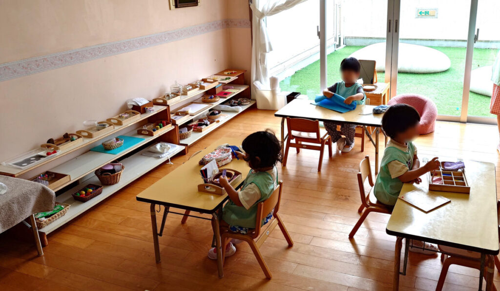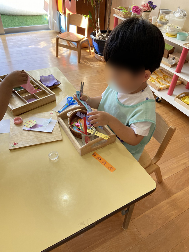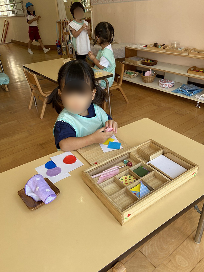 モンテッソーリ教具を自分で選び、たくさん手を使い、指先を動かし...。