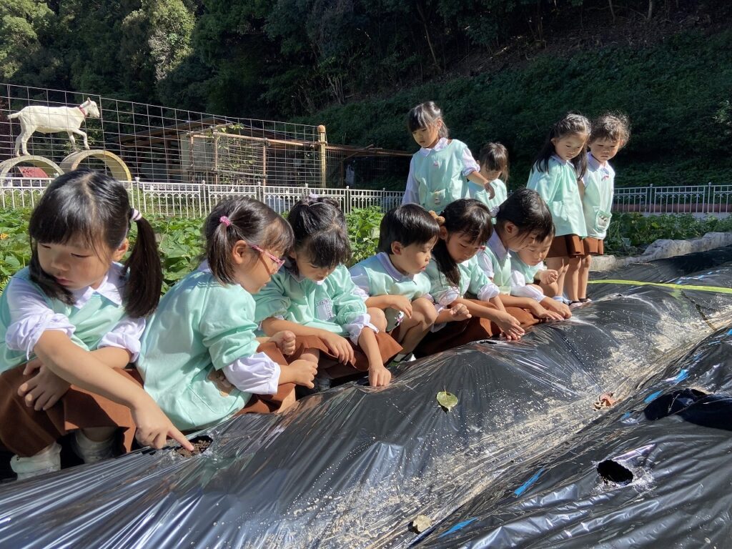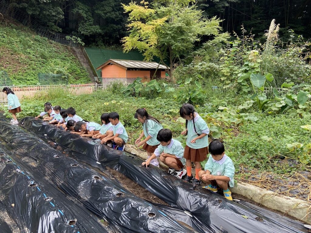 アントニオ冬のおたのしみ=大根抜き。耕され、黒マルチシートを張り、137個の穴が開いています。 こどもたちは3日かけて1穴に3つの種をうえました。さあ、また今年も、立派な大根に育ちますように!