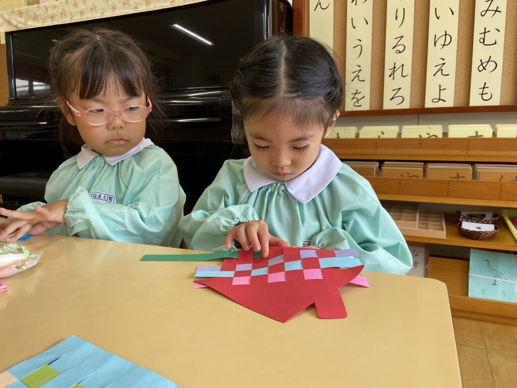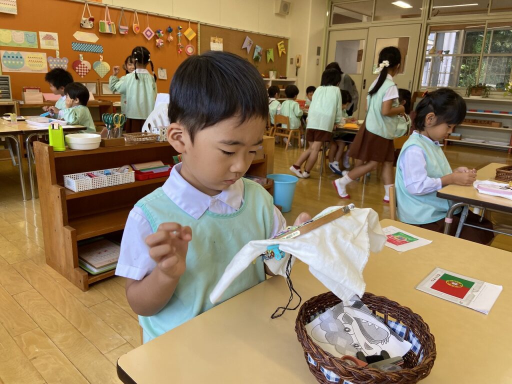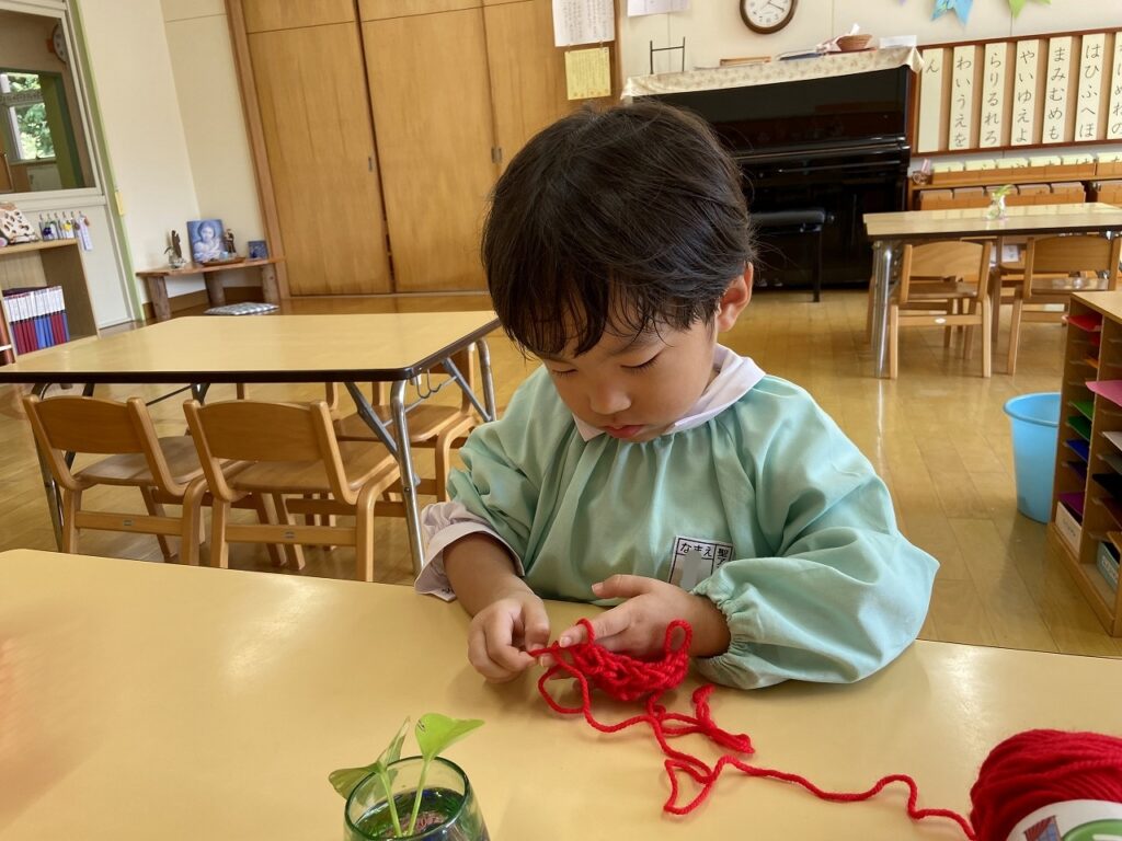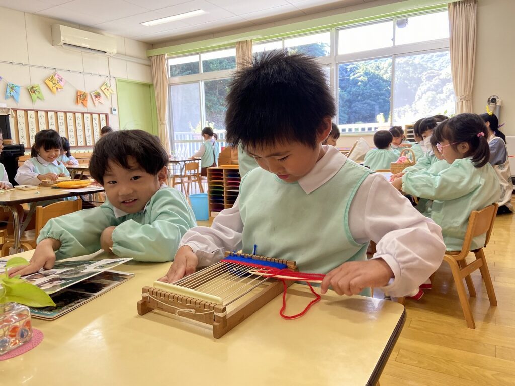 秋が深まり、少し寒い日も。モンテッソーリ教育では、自分がしたいと思う活動を、選んで取りくみます。自分中心?と思いきや、クラスのお友達の影響を受けて、互いに響きあうことも。今は、編み物がブームになっています。指編みに挑戦する年少児。マフラーを編む年中長児。それぞれに冬への備えは万全に。