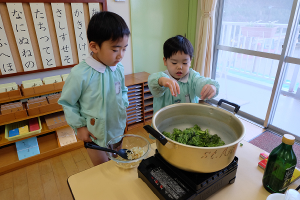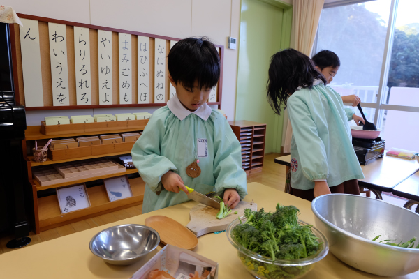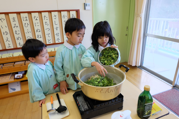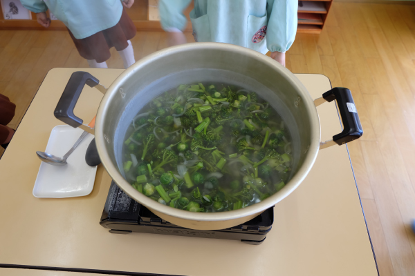 今日は芽キャベツのスープづくり。ブロッコリーを切って、お鍋に入れて、お水を注いで…。ぐつぐつしてくると、こどもたちはお鍋をのぞきこんで大興奮でした。
