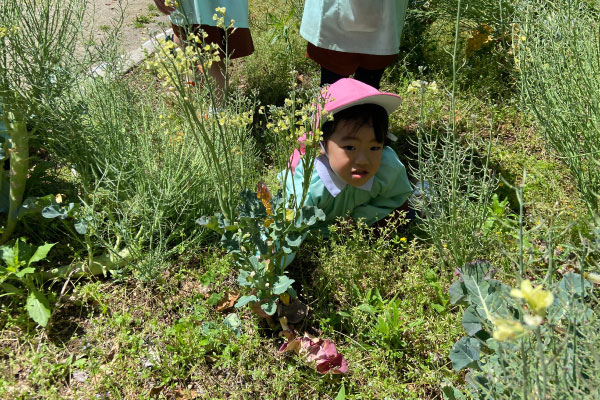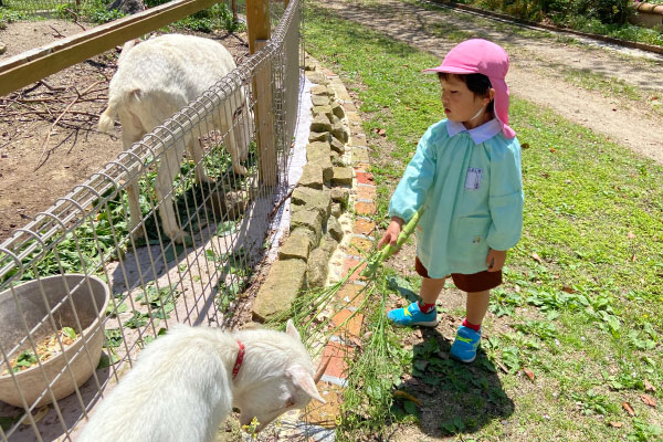 ブロッコリーを収穫したあとに残った部分を抜いて、ヤギさんへ。「どうぞ」と差し出すと、むしゃむしゃ。畑の恵みは、こうして次へとつながっていきます。