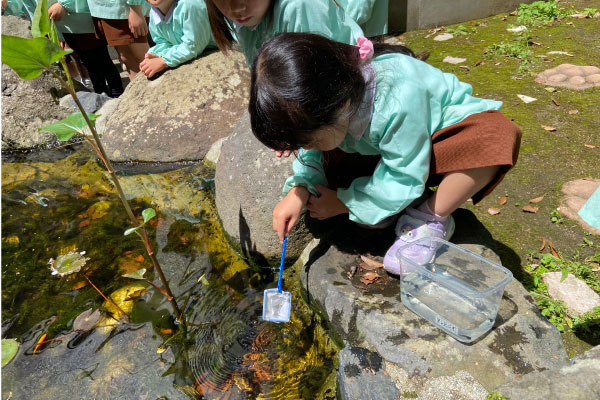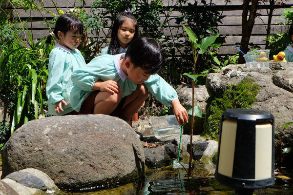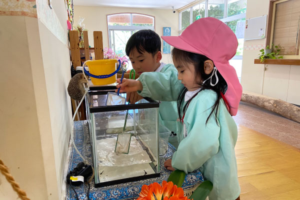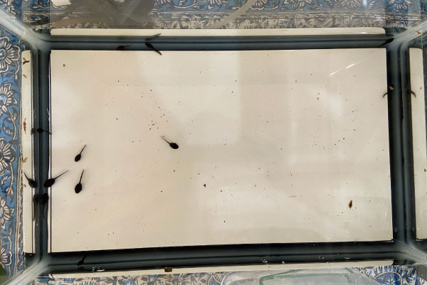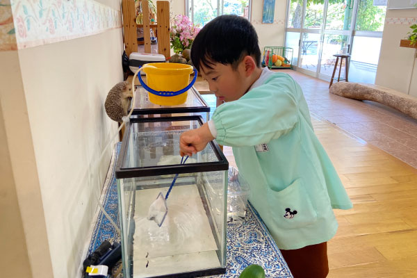 パテオの池の中の、小さなおたまじゃくし。そっとすくって、水槽へ。これからどんな姿に変わっていくのか、楽しみな時間が始まりました。