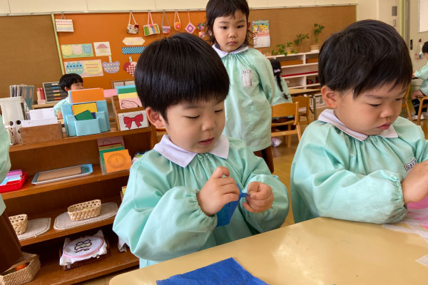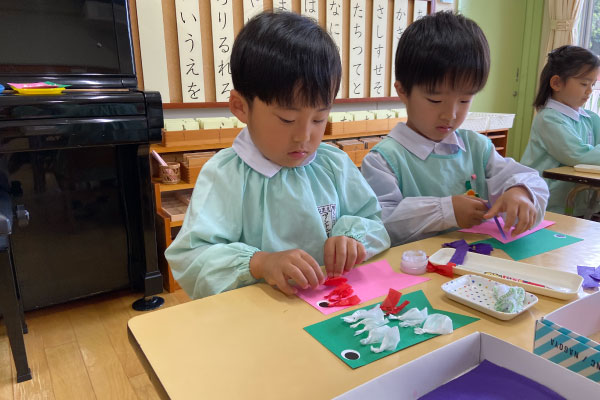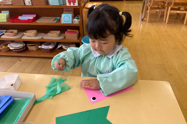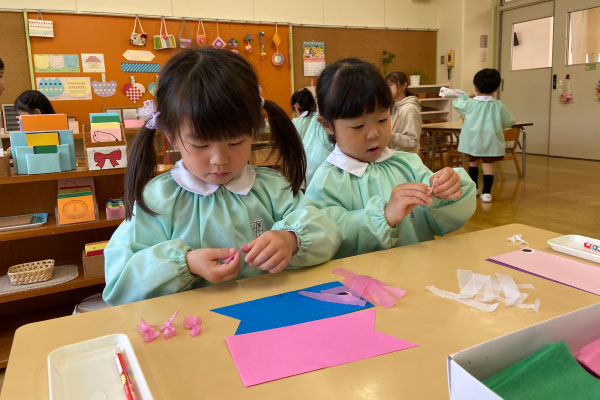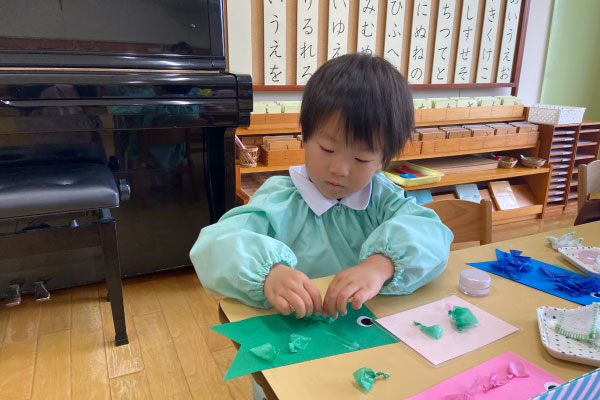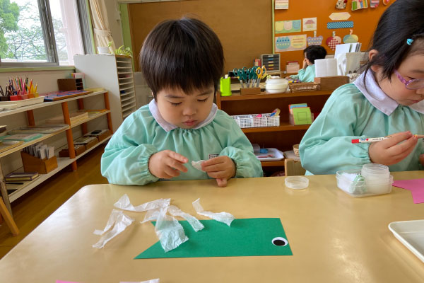 お部屋でこいのぼり制作。小さな紙をひとつひとつ貼りながら、真剣な表情のこどもたち。少しずつ形になっていくのが、なんだか楽しい時間です。