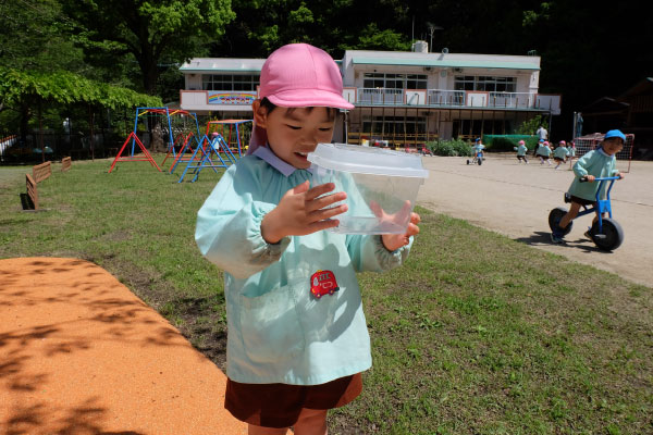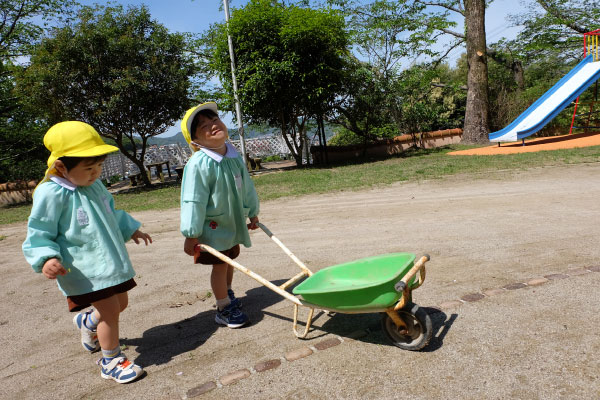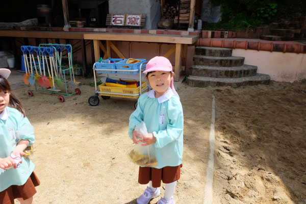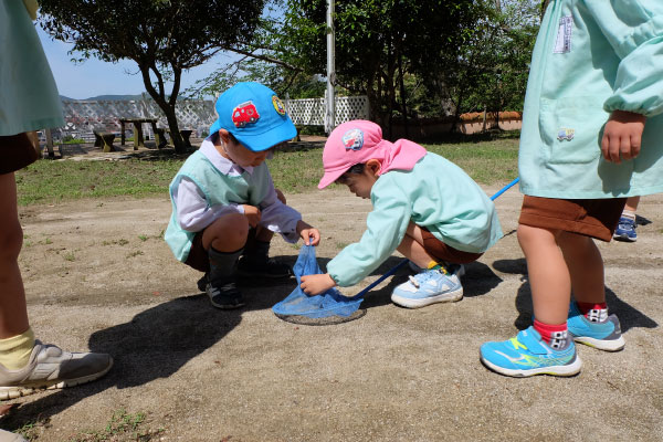 園庭のひとコマ。それぞれが自分のやりたいことを選び、じっくりと取り組む時間。思い思いの活動を楽しんでいます。