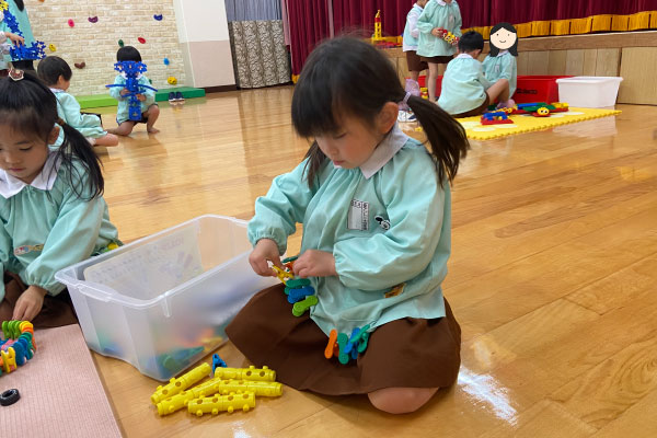 ホールでは、それぞれが好きな遊びを見つけて、じっくり取り組んでいます。つなげたり、組み立てたり、「こうしたらどうなるかな?」と試しながら、少しずつ形になっていくのが楽しい時間です。